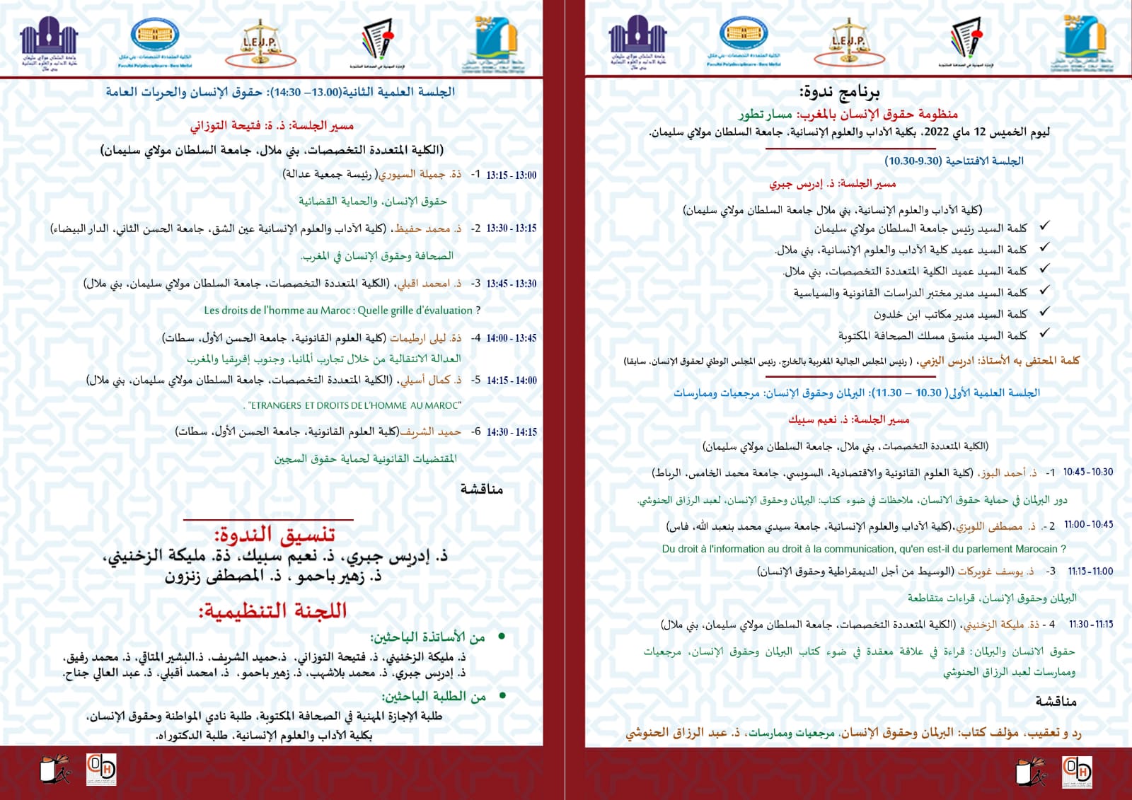 يُنظم مختبر الدراسات القانونية والسياسية بالكلية المتعددة التخصصات ببني ملال، ومسلك الاجازة المهنية في الصحافة المكتوبة بكلية الآداب والعلوم الإنسانية ببني ملال، بشراكة مع مكاتب ابن خلدون ندوة علمية في موضوع «منظومة حقوق الانسان في المغرب مسار تطور»، وذلك يوم الخميس 12 ماي 2022 في قاعة الندوات بكلية الآداب والعلوم الإنسانية بني ملال ابتداء من الساعة التاسعة والنصف صباحا.